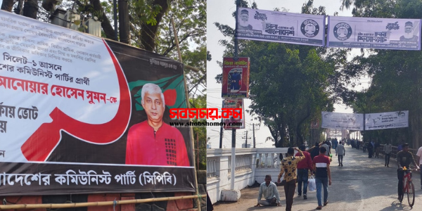 বাংলাদেশ কমিউনিস্ট পার্টির প্রার্থী মোহাম্মদ আনোয়ার হোসেন সুমন রিকাবীবাজার, বন্দরবাজার, চৌহাট্টা, শাহী ঈদগাহ ও ওসমানী মেডিকেলসহ বিভিন্ন এলাকায় ফুটওভার ব্রিজে বড় আকারের রঙিন পিভিসি বিলবোর্ড সাঁটিয়েছেন।
