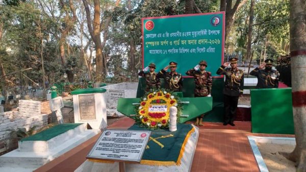 সোমবার (১৬ ফেব্রুয়ারি) সকাল সাড়ে ৯টার দিকে সিলেটে সামরিক আনুষ্ঠানিকতার মধ্য দিয়ে তার সমাধিতে পুষ্পস্তবক অর্পণ করা হয়।
